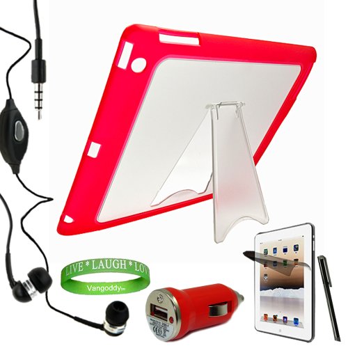 Apple iPad 2 Kickstand Case 2nd Generation TPU Skin Red with Kickstand Snap On Cover + Compatible USB Red iPad 2 Car Charger + iPad 2 Precut Screen Protector to Ensure That No Scratches Occur On Your Screen + iPad 2 Stylus + Compatible iPad 2 Earbuds Earphones with Microphone + Live * Laugh * Love Vangoddy Wrist Band!!! feature